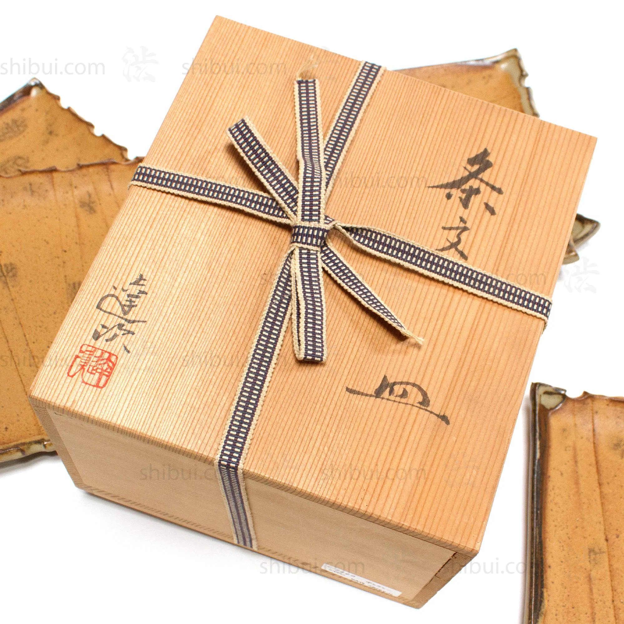 Set of five Seto-yaki serving plates. Created by Kato Tatsuji. Yellowed glaze. Signed box.