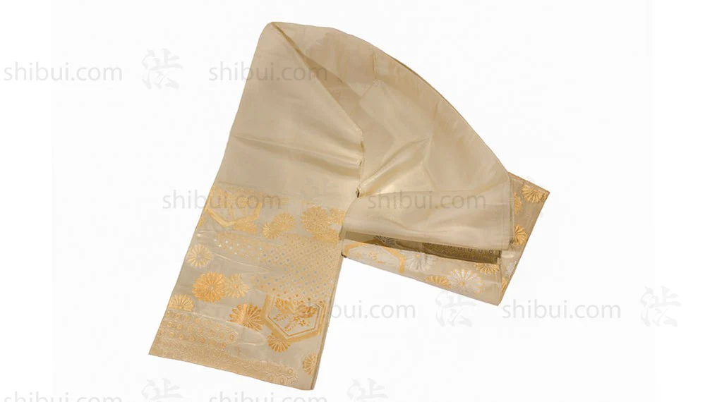 Handwoven brocade Nagoya style fukuro obi 袋帯 (pouch obi) with a pattern including paulownia leaves, tortoise, and chrysanthemum patters. This is the second most formal type of obi and the most commonly used today.